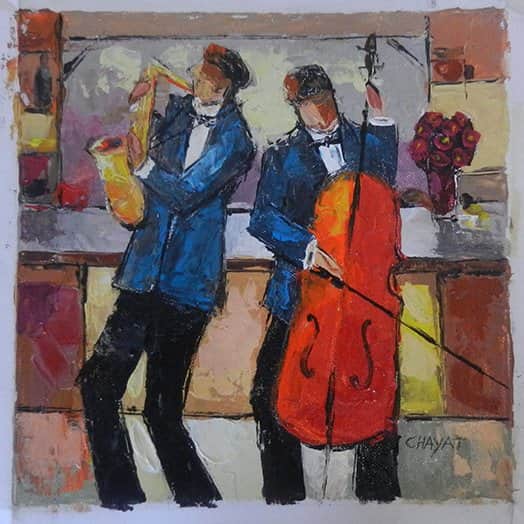 יעקב חיט הוא צייר ישראלי אהוב, הידוע בציוריו הססגוניים והאופטימיים המתארים רגעים של שמחה, מוסיקה ותנועה. בעבודותיו משתקפת אהבתו הגדולה לאדם ולחיי התרבות, דרך צבעוניות עשירה ומרקם ציור חופשי ובטוח. ציור זה מבטא את החום והקצב שמאפיינים את סגנונו הייחודי – שילוב של אנרגיה, רגש ואמנות ישראלית מקורית.