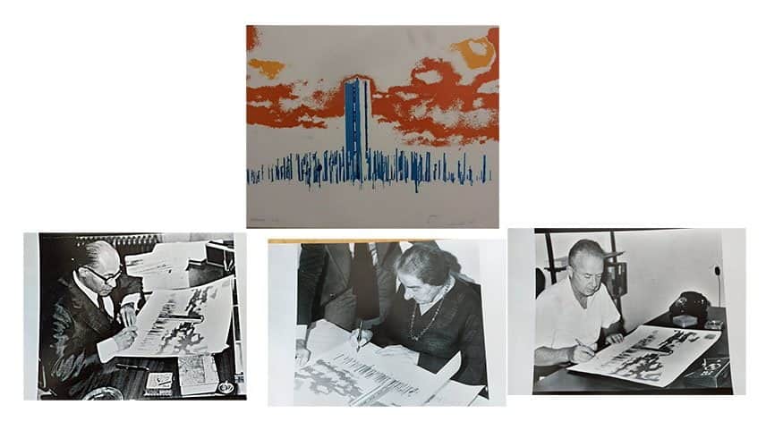 ליטוגרפיה לוחמי הפלדה משנת תשלח חתומה עי שלושה ראשי ממשלה בגין רבין גולדה